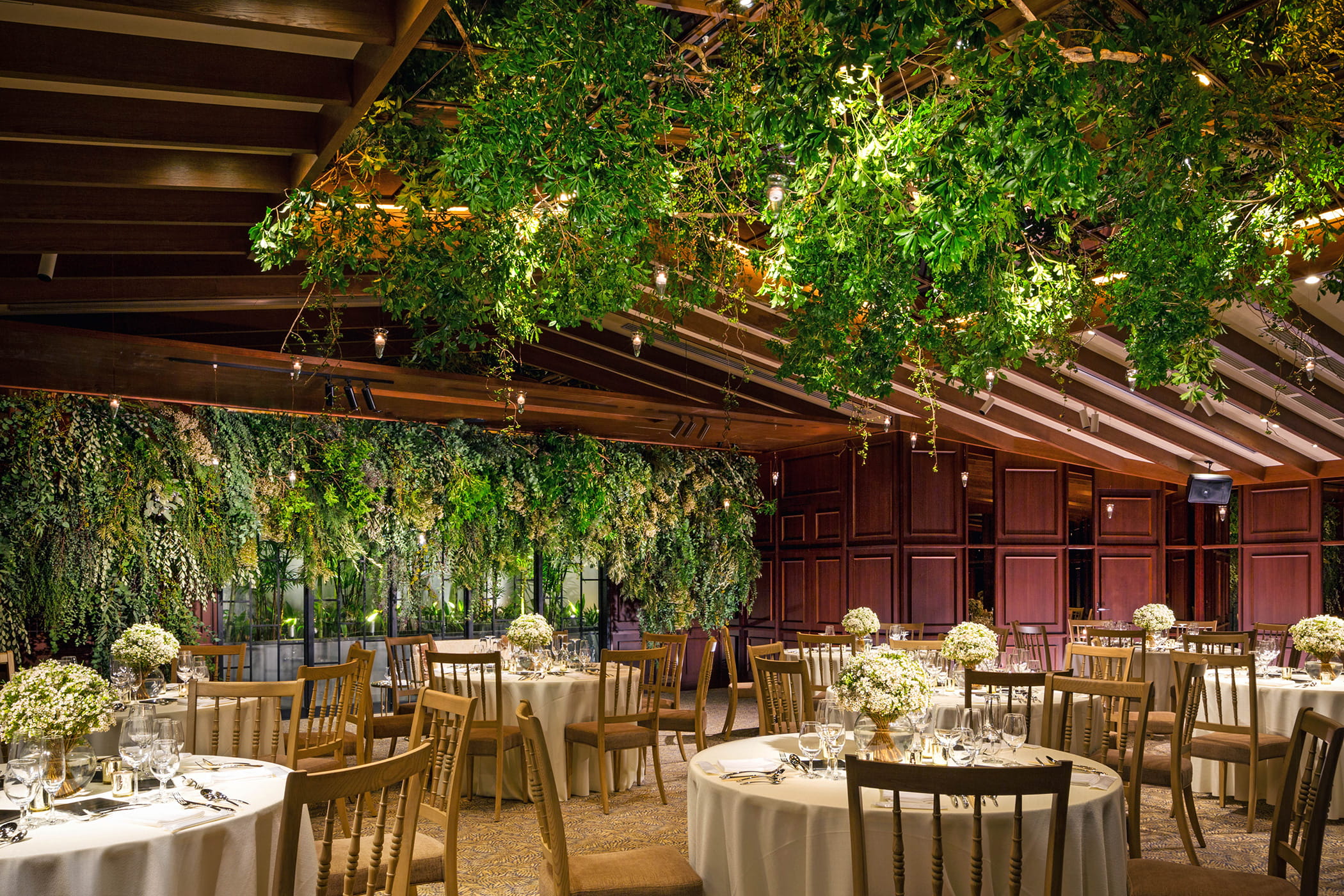 落ち着いた木のぬくもりと、重厚感を感じる上質な大人のバンケット。日本家屋をイメージした天井からの装飾も可能。おふたりらしさを自由に表現して。