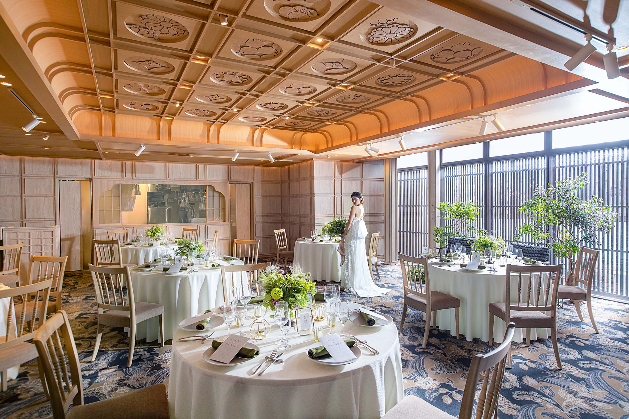 自然光が柔らかくお二人を包み込み、和も洋も楽しめるスタイリッシュなバンケット。