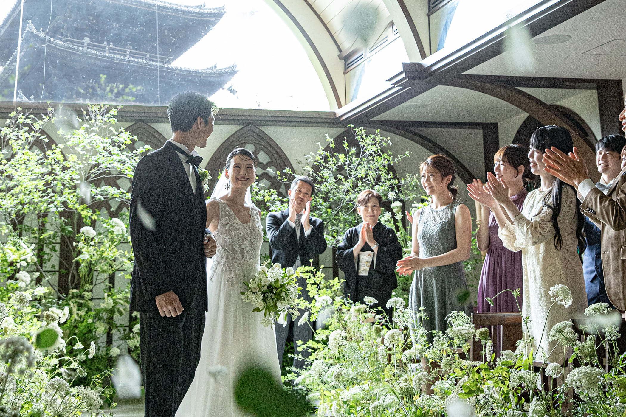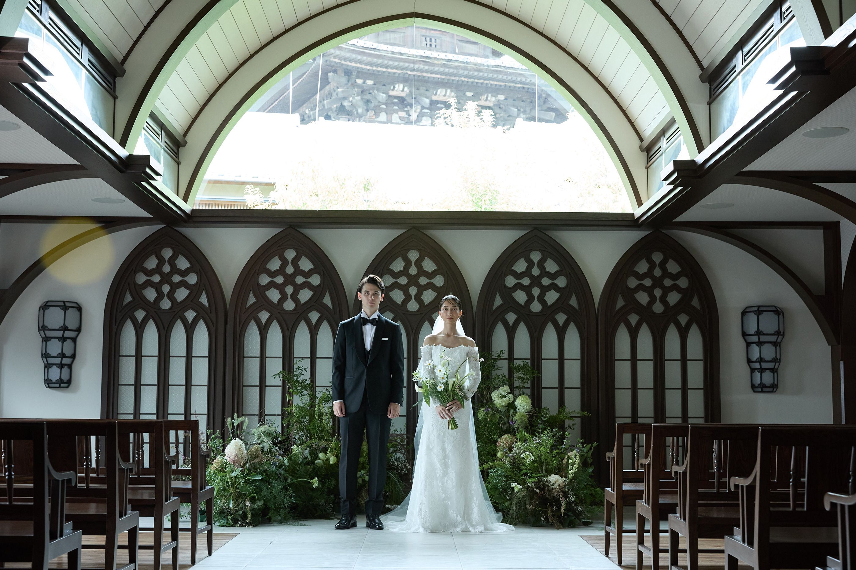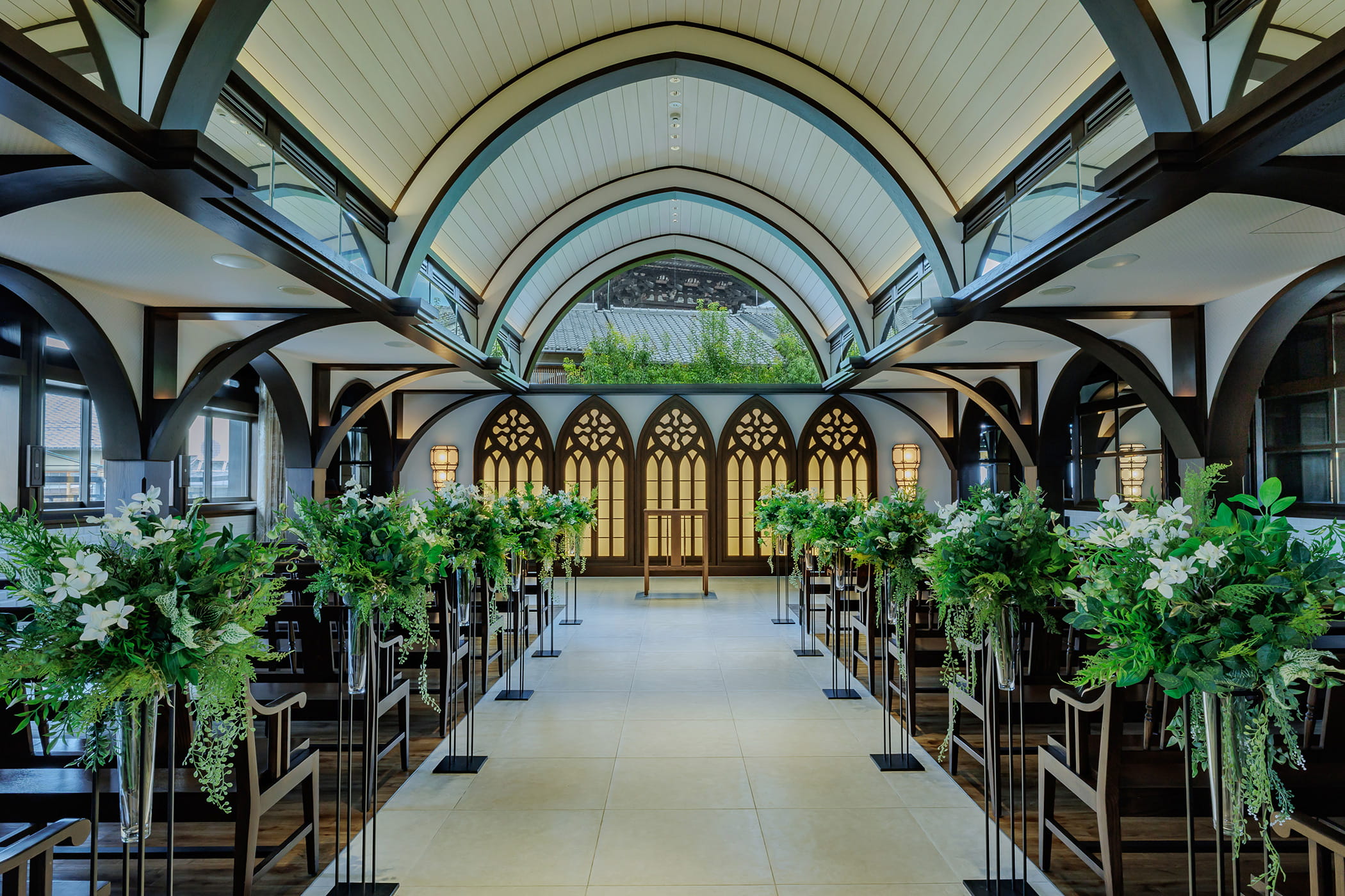 京都らしさを感じる壮観な佇まいに、ハープやオルガン、フルートの音色と聖歌隊の歌声が響く空間で、大切なゲストとの「ご縁」を感じる挙式を。