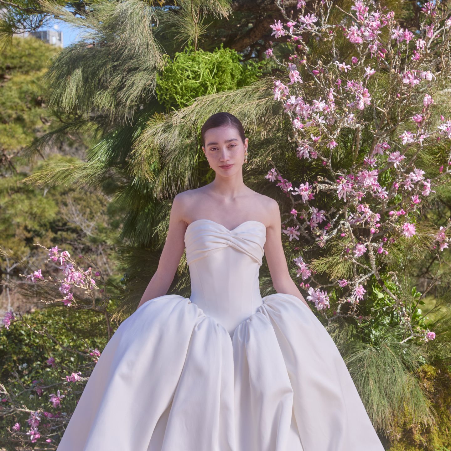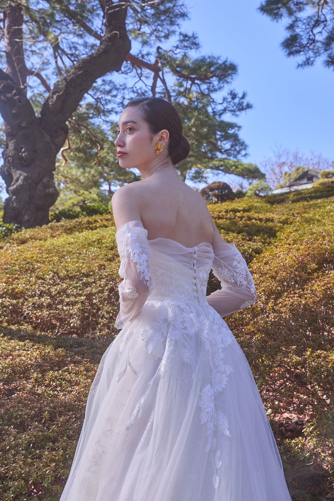 八芳園が考える日本の美意識をウェディングドレスに落とし込み、1からデザインを描き上げ制作したオリジナルドレスや、和の美意識をトレンドに落とし込む、KOTOHOGIを体現したインポートドレスをご用意しております。