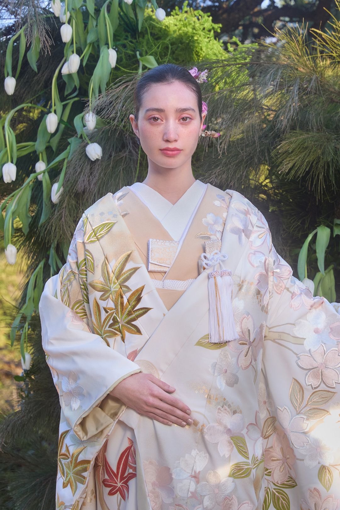 どの季節も美しい景色が広がる八芳園の庭園にインスピレーションを得て図案から制作したお着物をはじめ、伝統技術を継承する職人の手仕事と優れた感性が凝縮されたお衣裳をご用意しております。